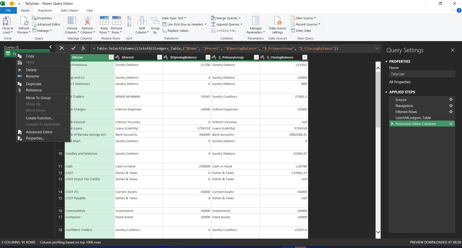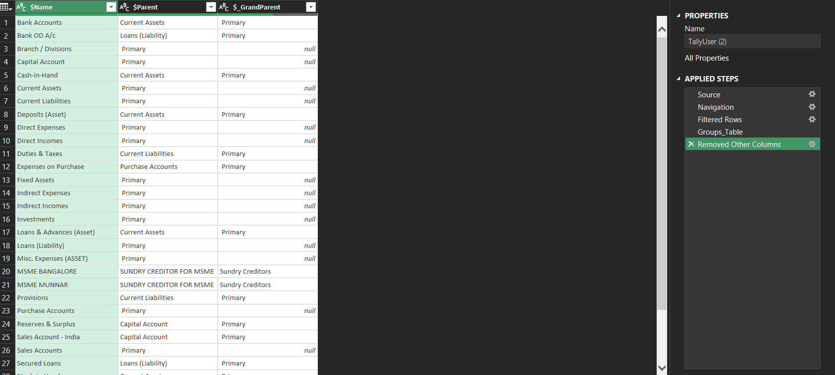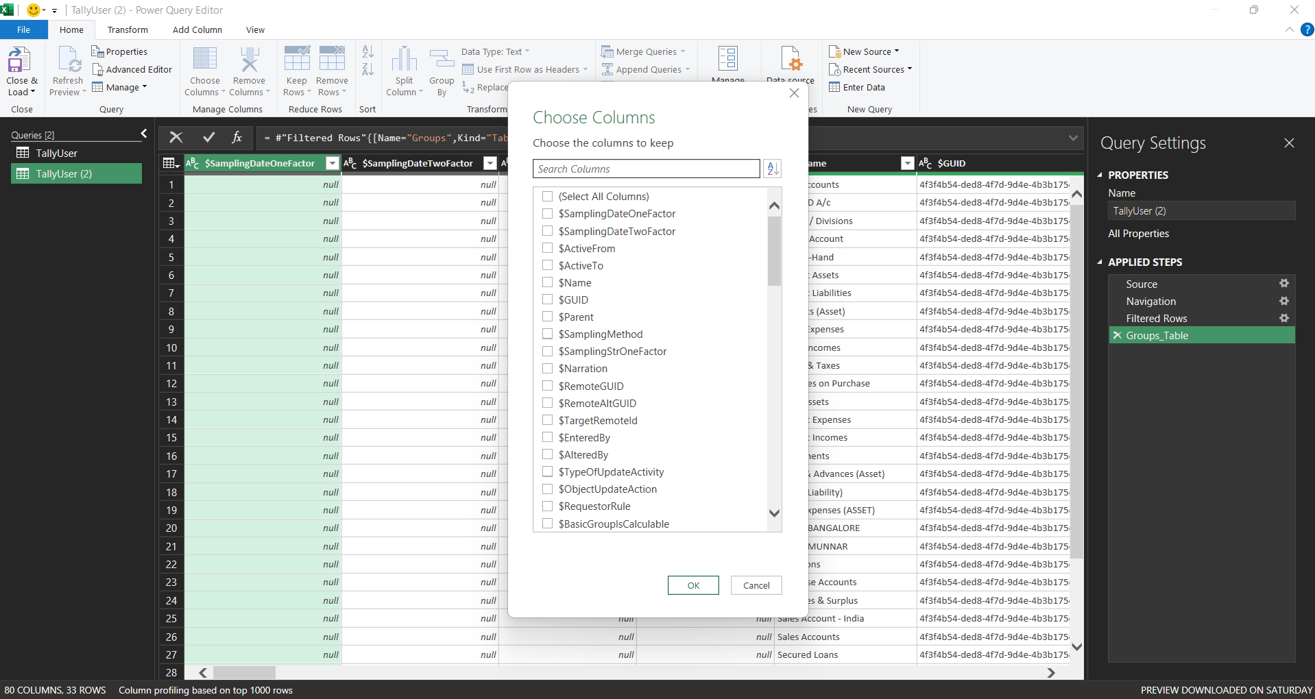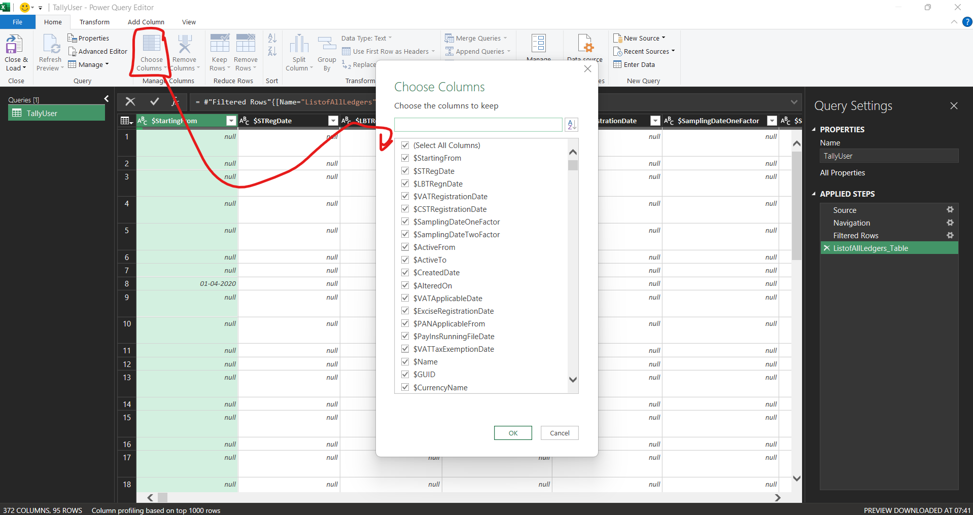 Step 13: Click Choose Columns and select the columns “Name”,”Parent”,”PrimaryGroup”,”opening balance”,”closing Balance”