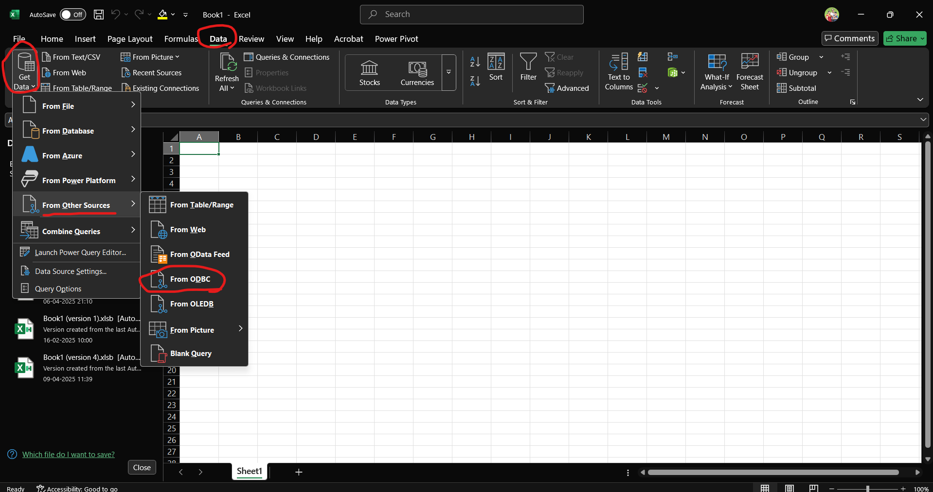 Step 7: Click on data tab, then Get data -> Other Sources -> From ODBC